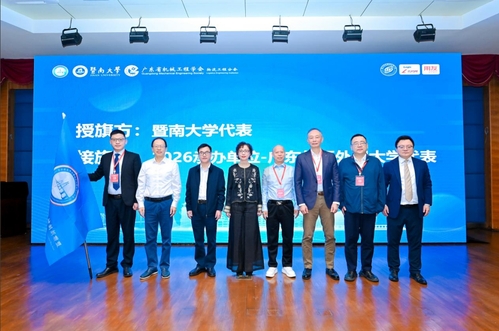 此外,大会还举行了隆重的授旗仪式,在顾乃华校长、伞景辉副局长、珠海市科协副主席刘建飞、以及联盟名誉会长谢如鹤教授、联盟副会长张惠民教授的共同见证下,承办单位代表屈挺教授及联盟理事长许治教授将旗帜授予2026年承办单位——广东外语外贸大学代表丁浩副院长,标志着物流与供应链管理创新理念在粤港澳大湾区的传承与深化发展。